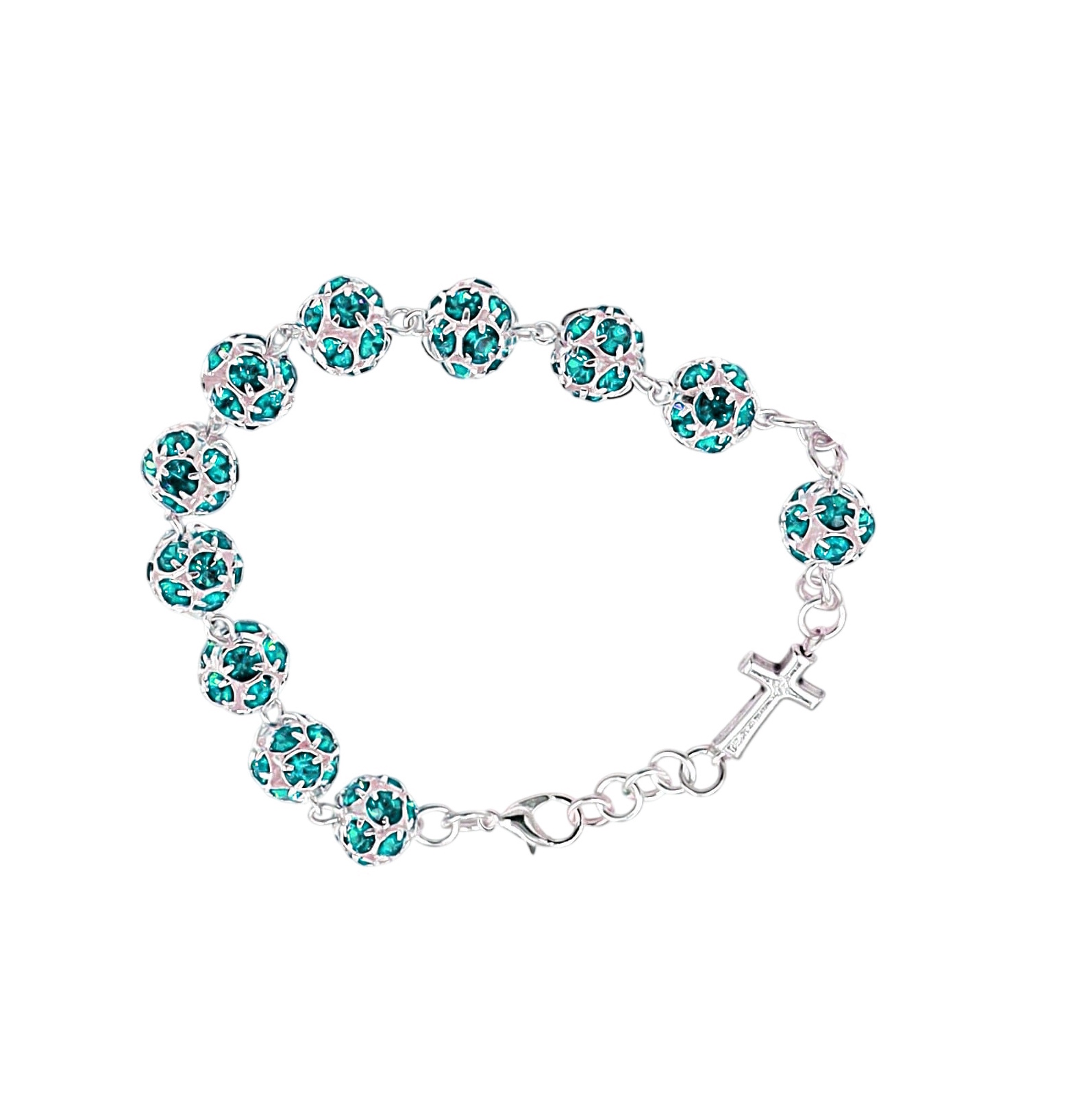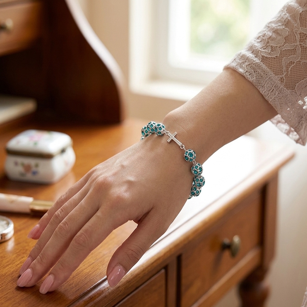 Bratara eleganta, realizata din cristale preziosa turquoise de 8 mm si impodobita cu o cruciulita de 15 mm