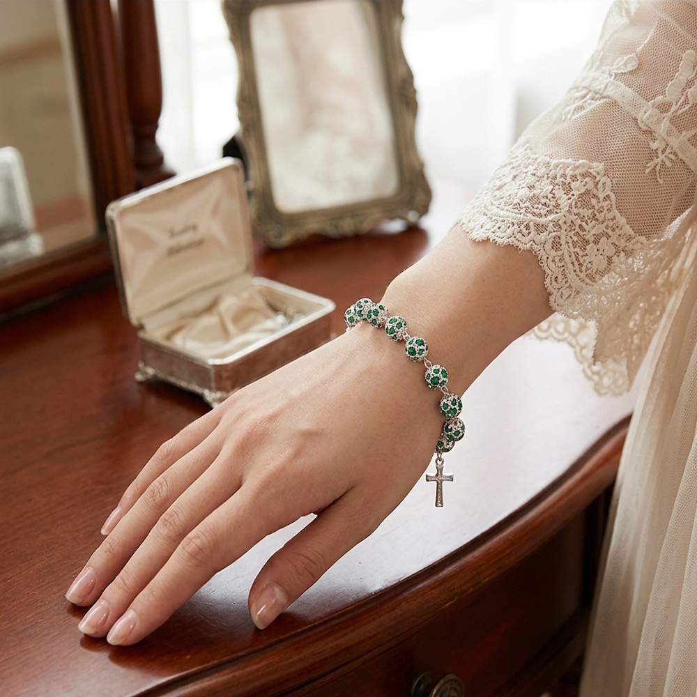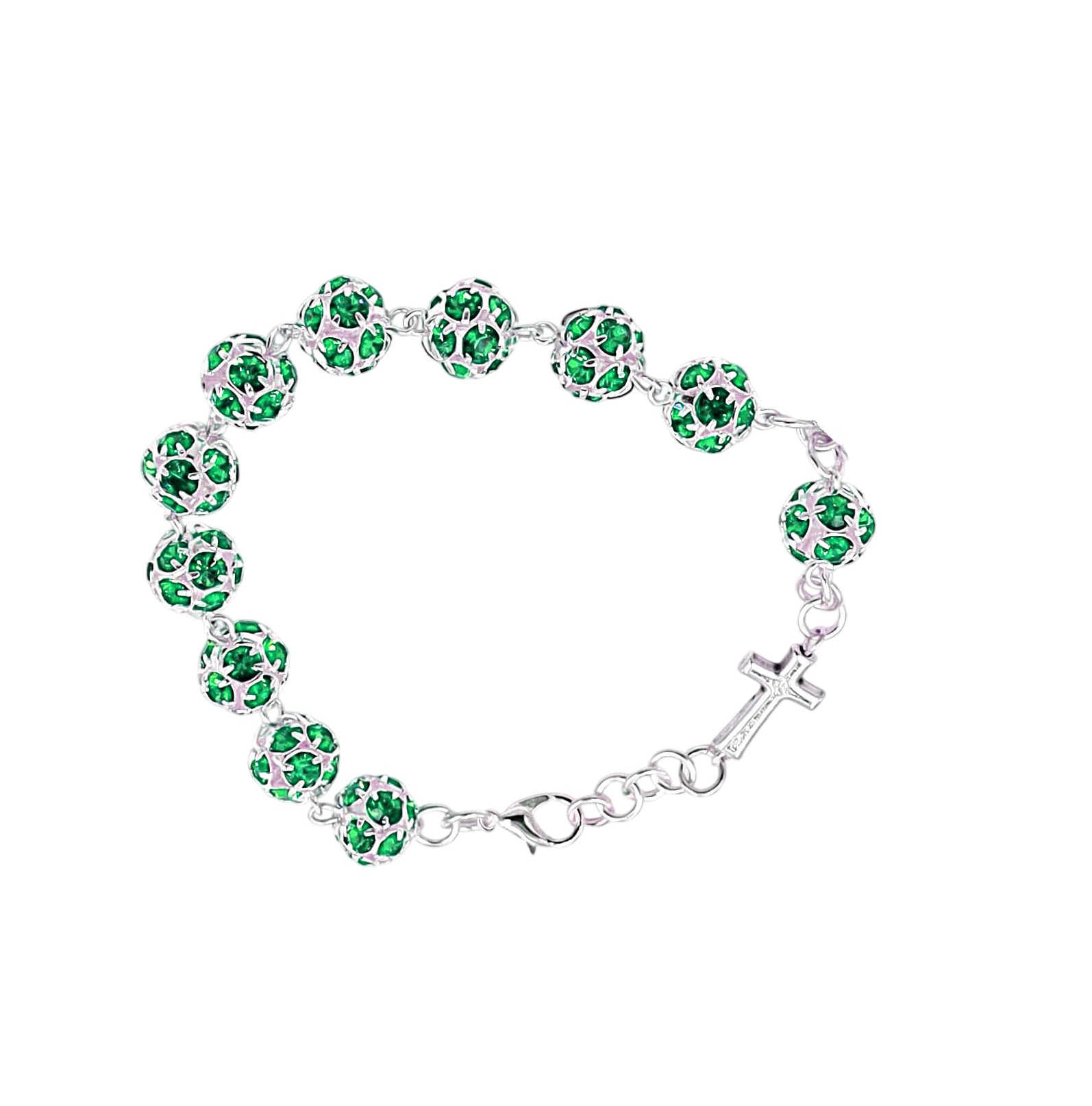Bratara eleganta, realizata din cristale preziosa verzi de 8 mm si impodobita cu o cruciulita de 15 mm