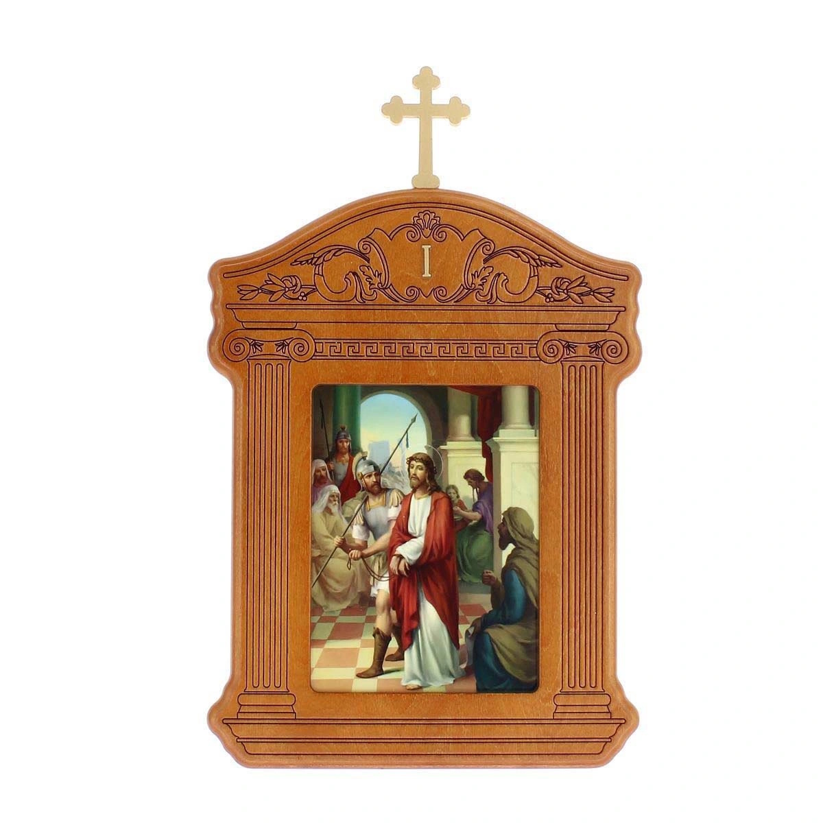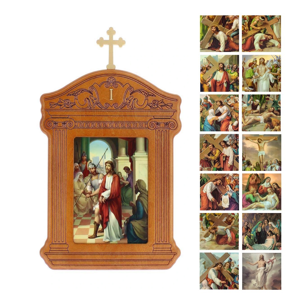 Calea Crucii din lemn de mesteacan colorat si decorate in forma de templu