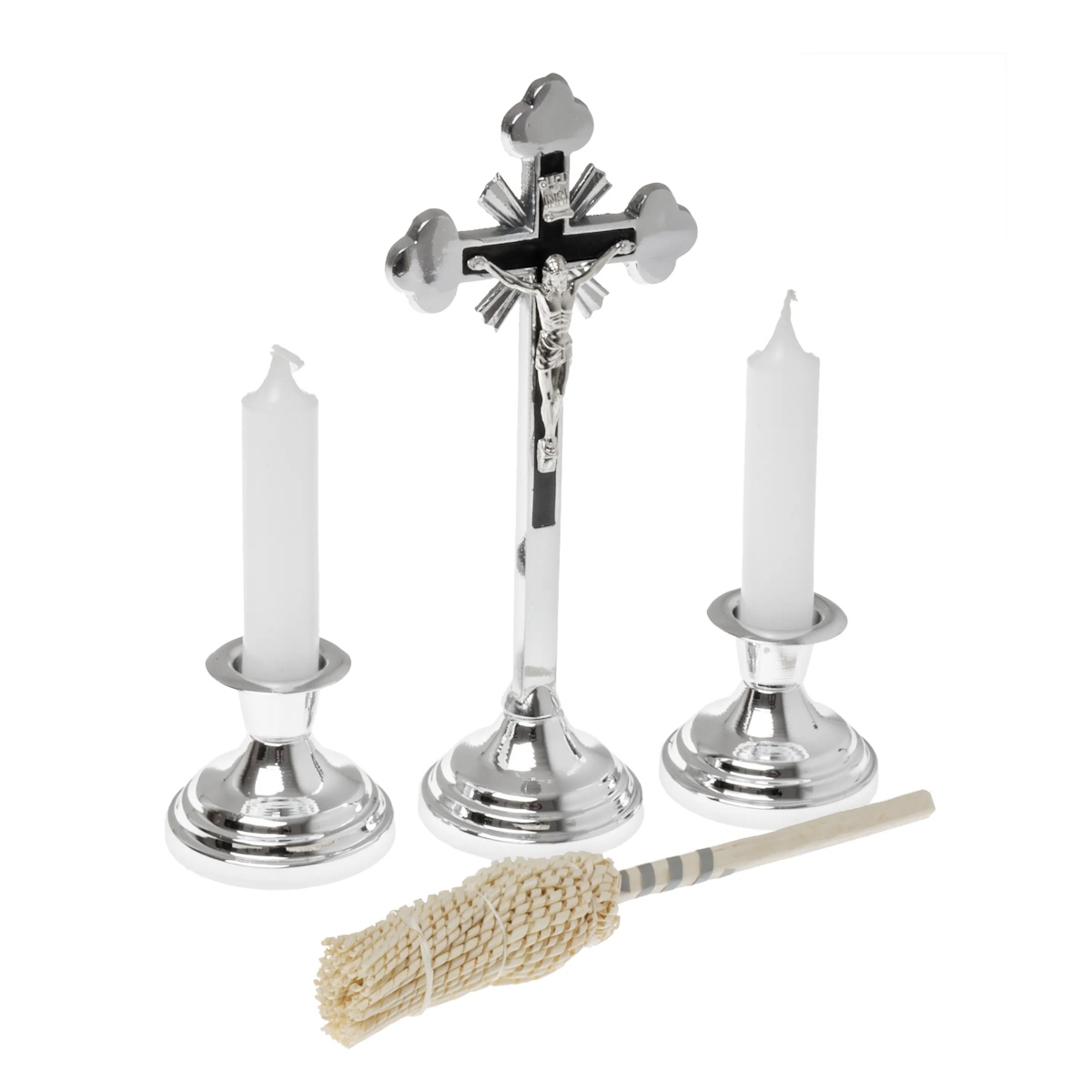 Cruce din metal cromat cu doua sfesnice. Setul include doua lumanari si mini aspersor pentru apa sfintita.