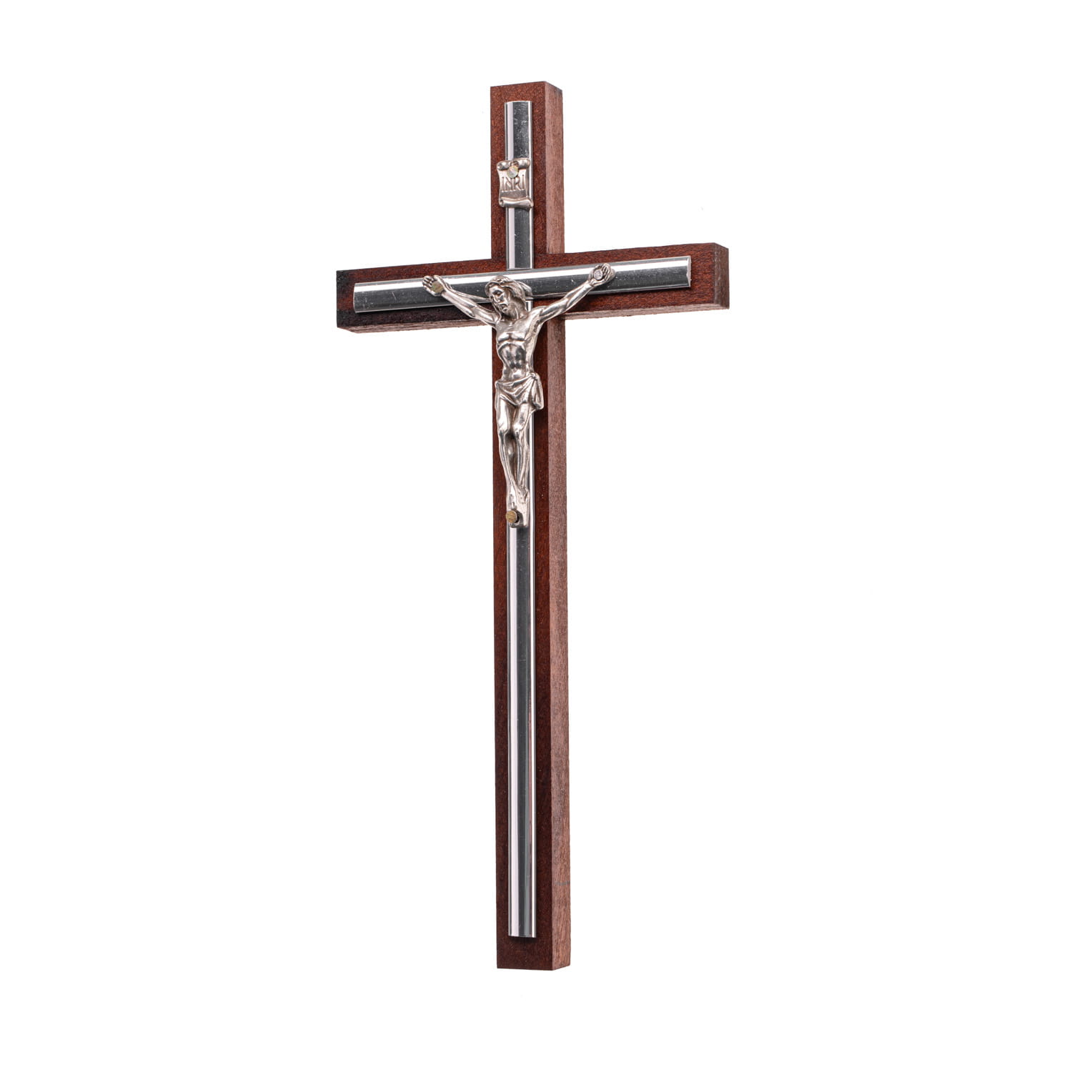 Cruce din lemn maro, corpus din metal si banda aurie.