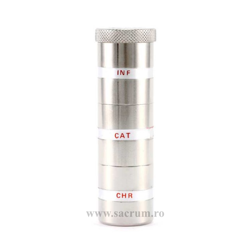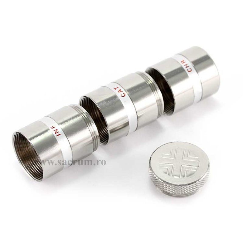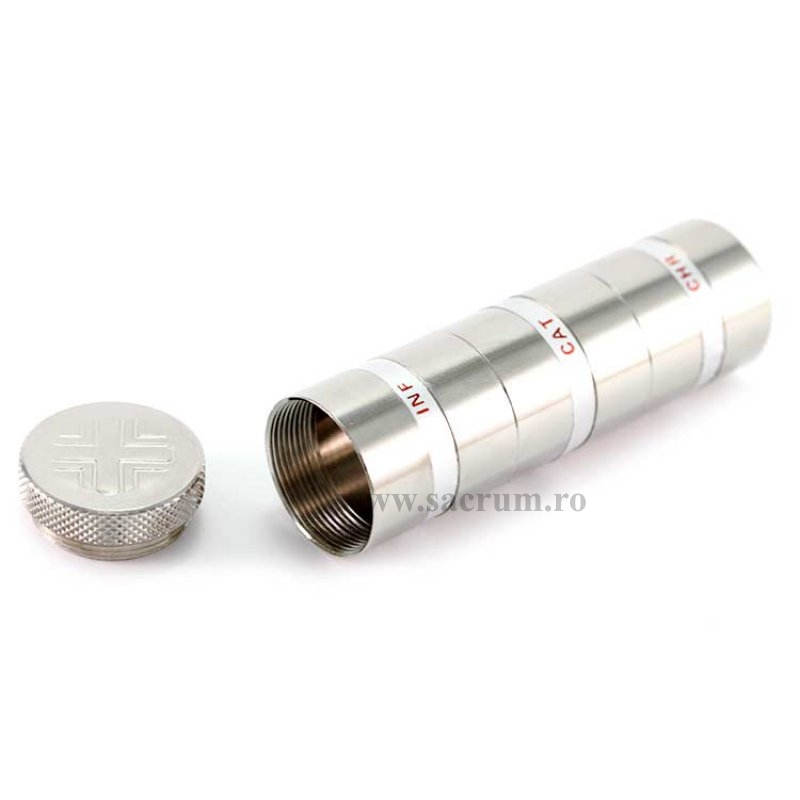 Uleiuri sfinte: vas triplu din metal argintat. Fiecare vas are diametrul de 2.6 cm si inaltimea de 3.2 cm.