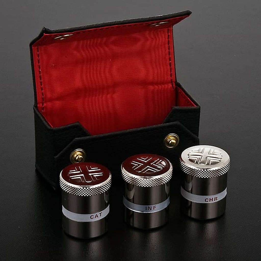 Contine 3 vase pentru uleiuri sfinte, argintate, fiecare cu diametrul de 2.6 cm si inaltimea de 3.2 cm