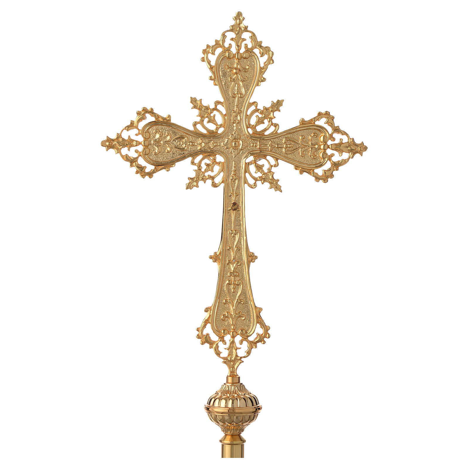 Cruce procesionala din alama aurita Poate fi purtata in procesiune cu ajutorul tijei din alama aurita si a?ezat? pe suportul