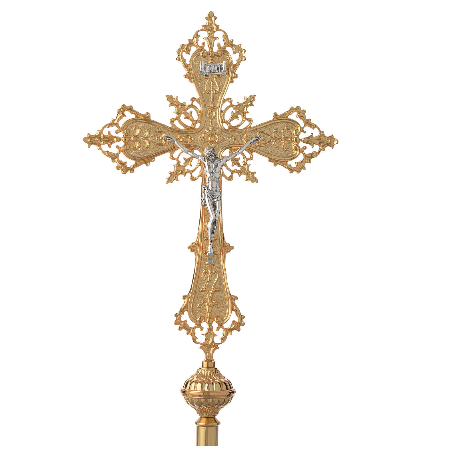 Cruce procesionala din bronz Crucea este realizata din bronz argintat, iar corpusul aurit, ce il face un produs de mare