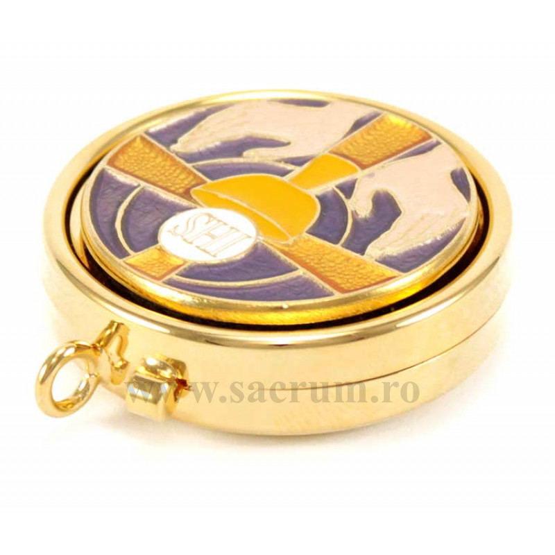 Cutie pentru ostii, din alama aurita, iar capacul din email lucios cu simboluri liturgice Dimensiuni: 5.4 x 1.5 cm