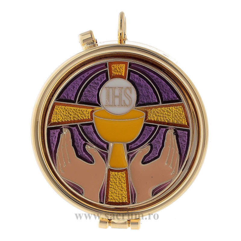 Cutie pentru ostii concelebrare din alama aurita si decorata IHS, inchidere clips, potrivita pentru pastrarea acestora in Tabernacol Diametru 17