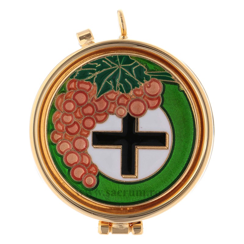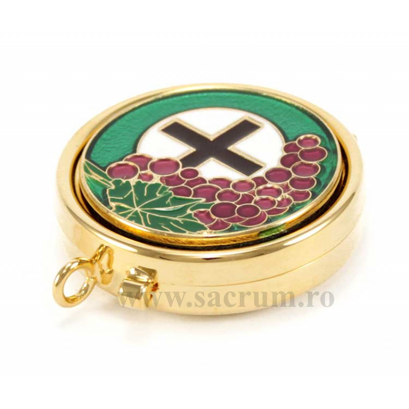 Cutie pentru ostii, din alama aurita, iar capacul din email lucios cu simboluri liturgice Dimensiuni: 5.4 x 1.5 cm