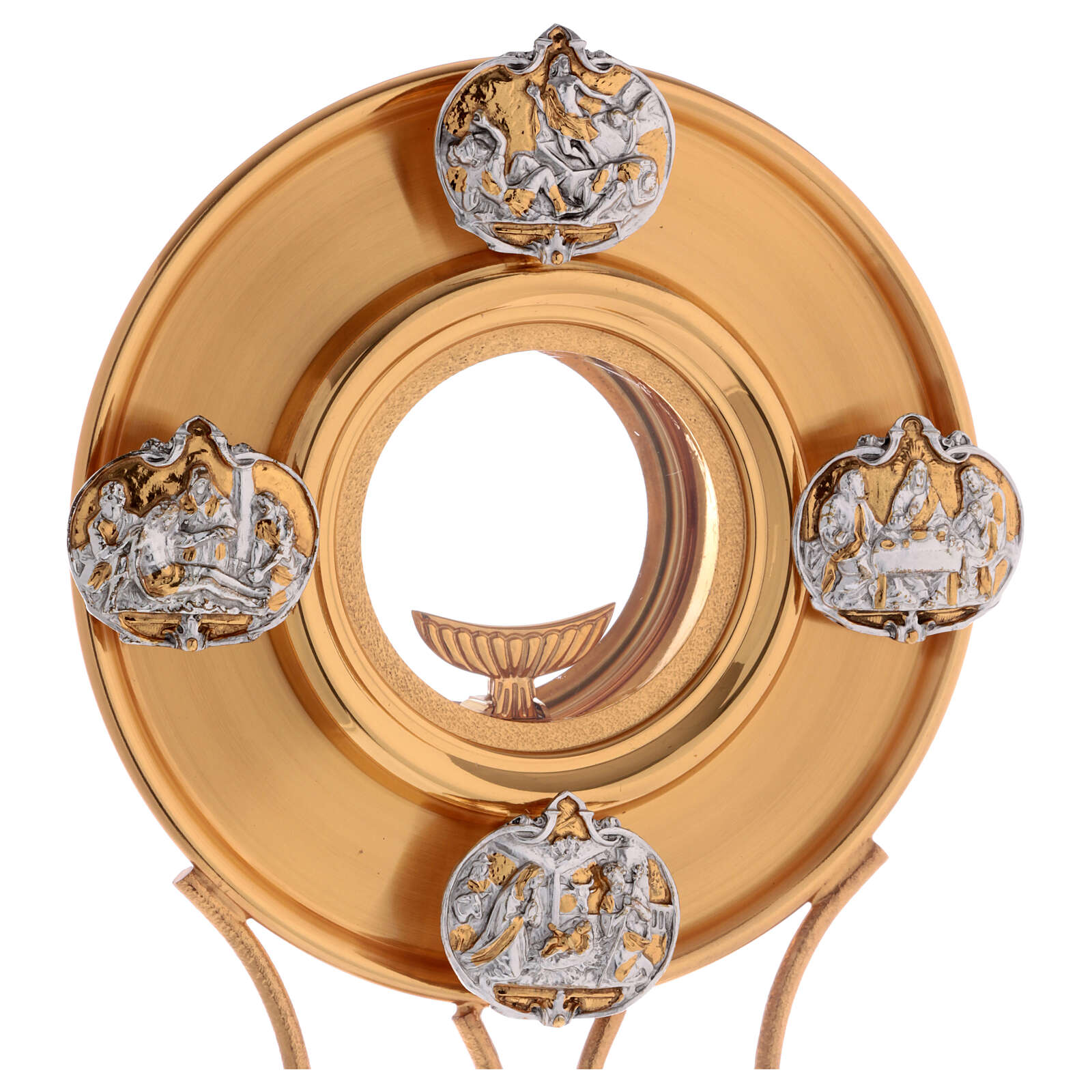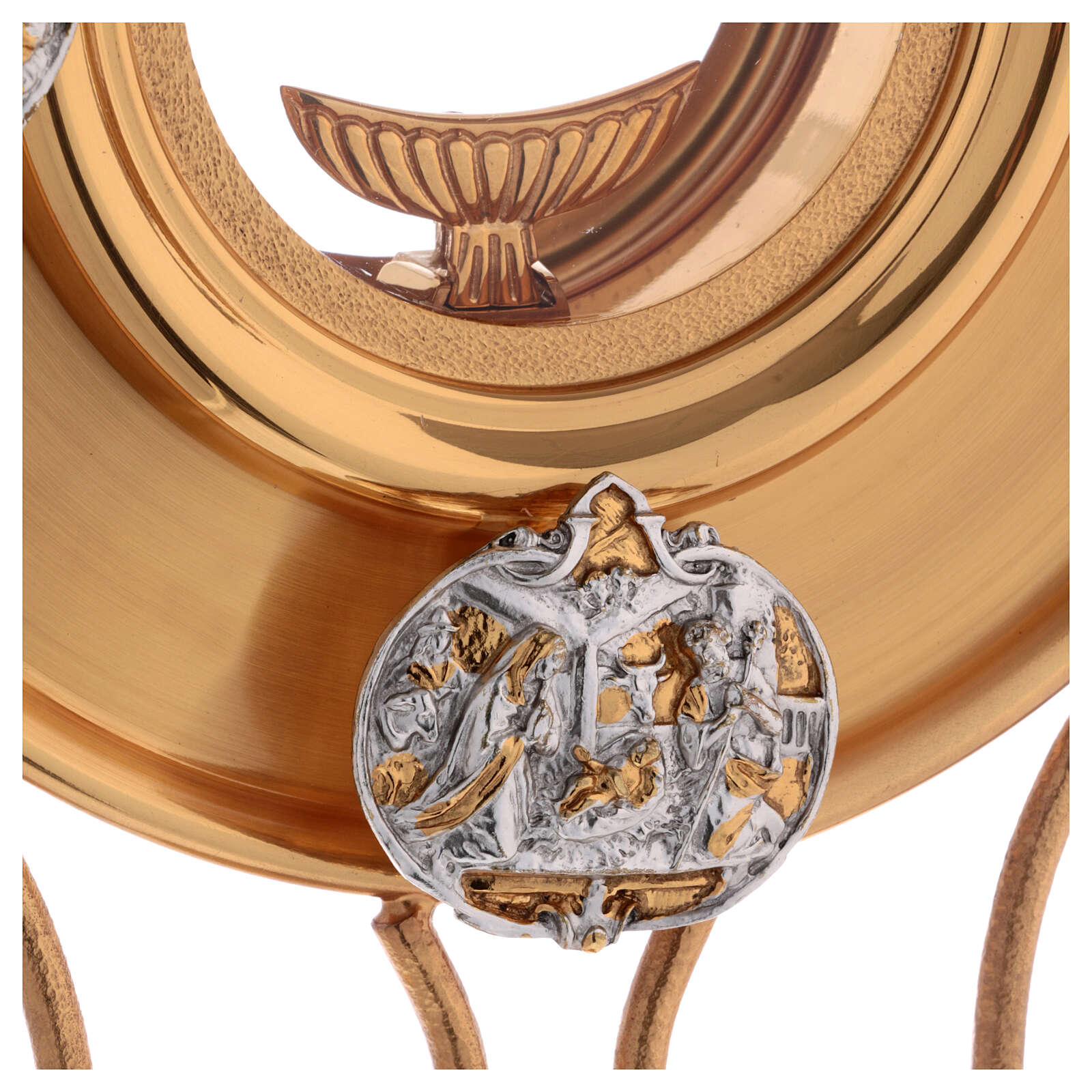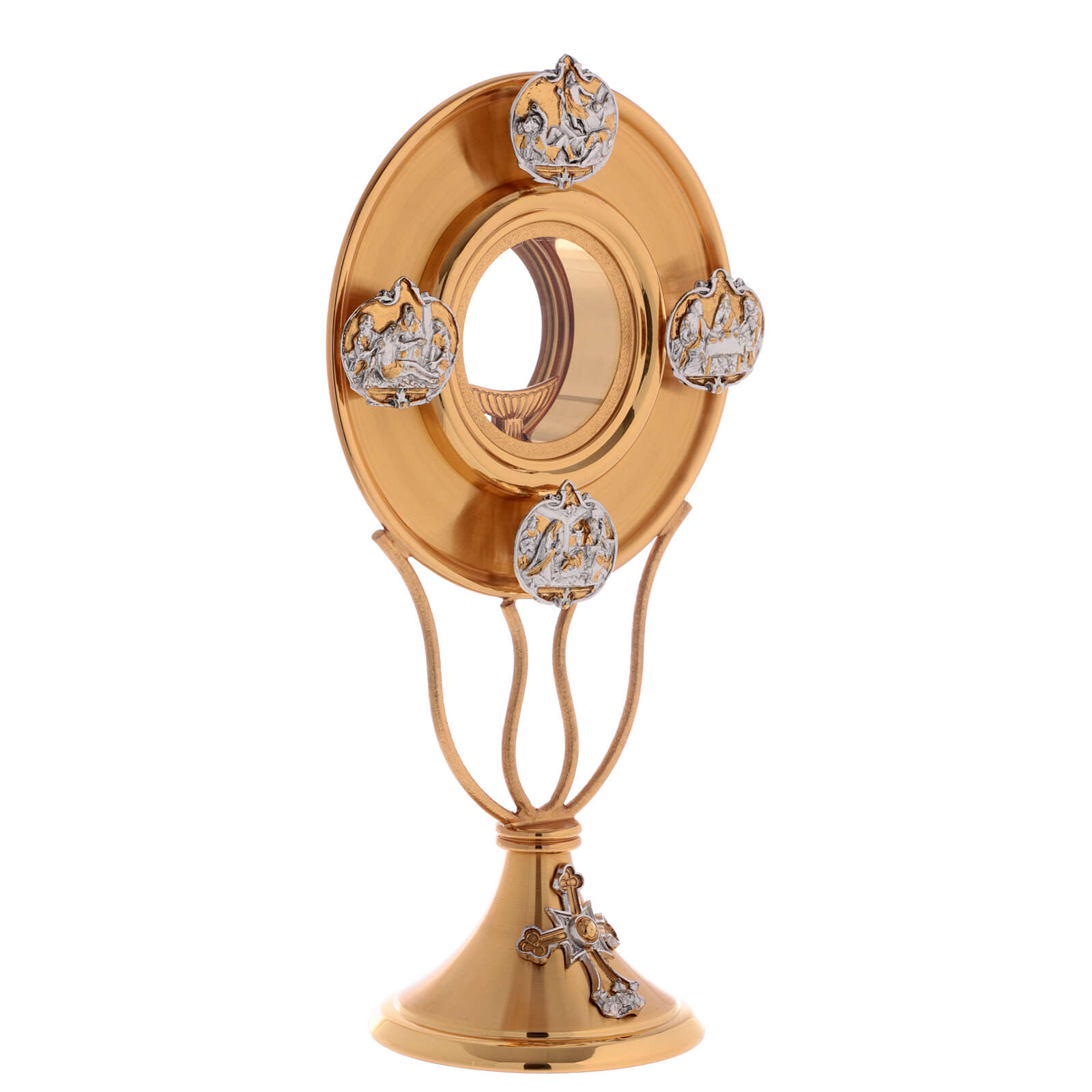Monstranta din alama aurita si argintata, cu insertii argintate care reprezinta cateva scene din viata lui Isus