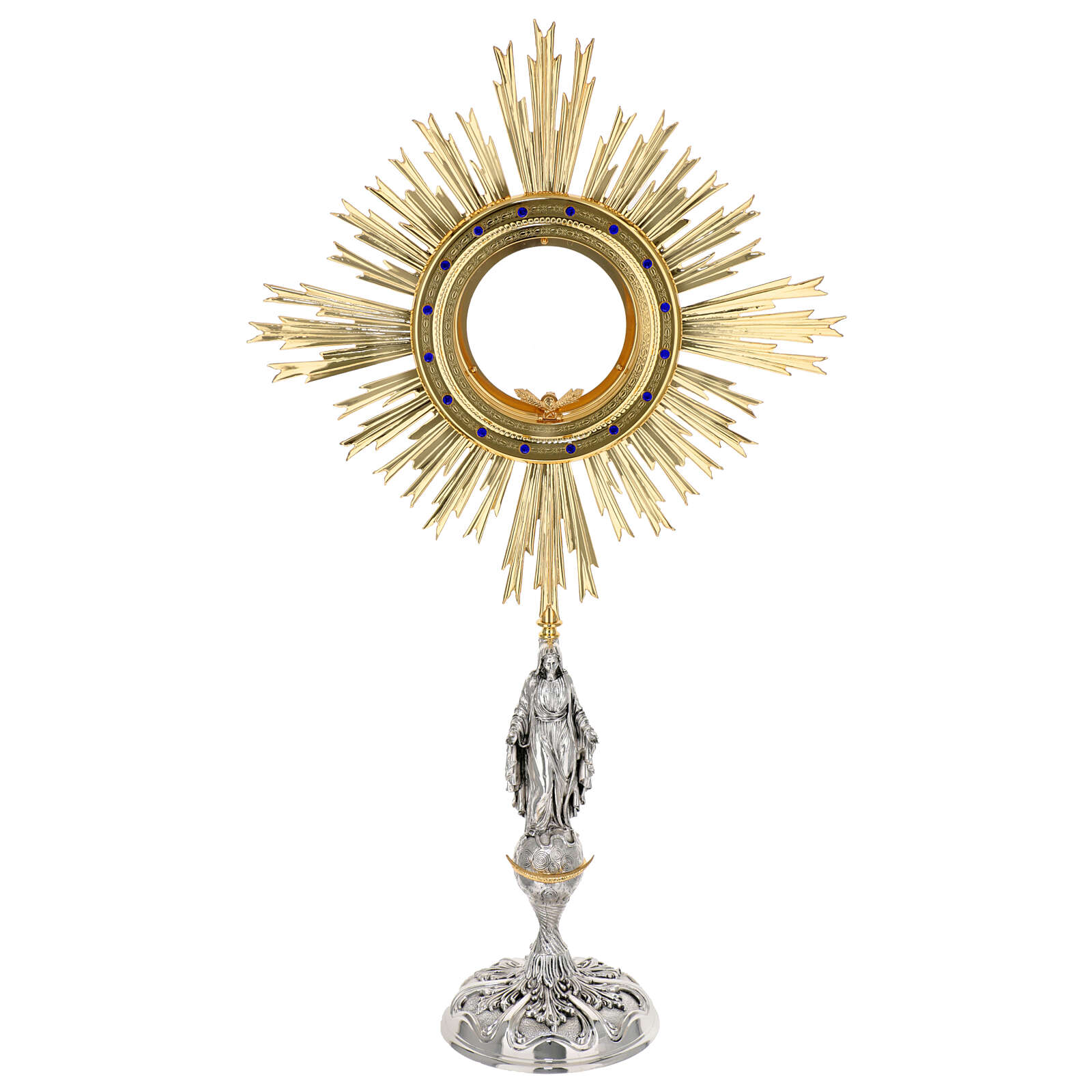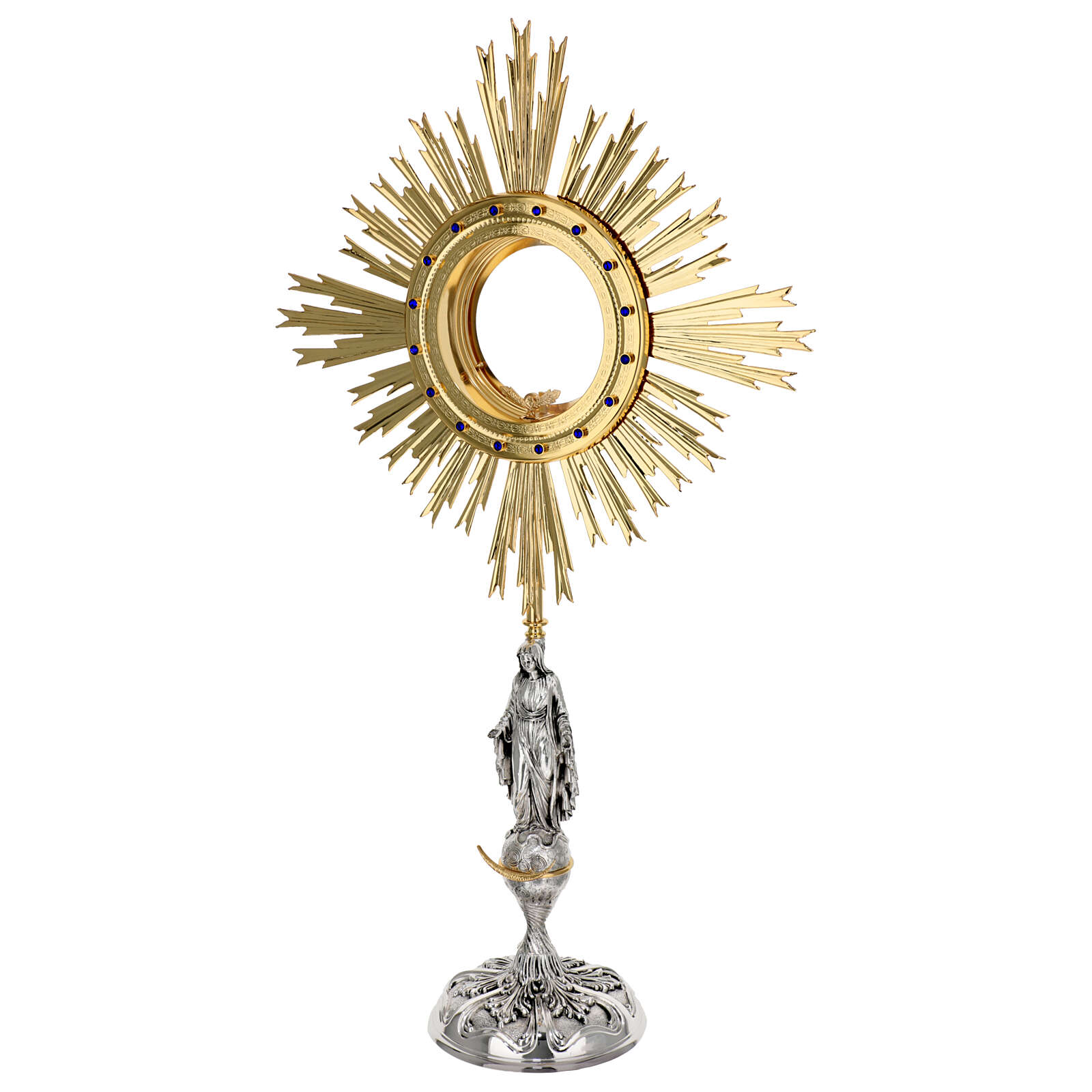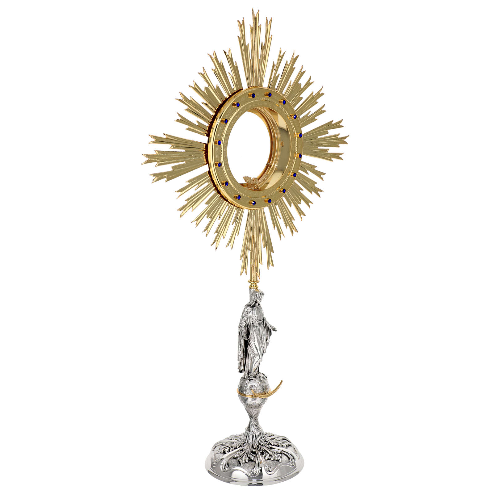 Monstranta solemna, realizata din alama placata cu aur 24K , cu o baza in stil baroc din care se inalta piciorul, luand forma unei sculpturi in relief a Neprihanitei Zamisliri. Fecioara, aici placata cu argint, este reprezentata cu mainile intinse usor in timp ce zdrobeste sarpele, simbol al pacatului originar fara de care a fost conceputa. La picioarele ei se afla o semiluna aurie. Aureola are un diametru de 50 cm si este impodobita cu pietre de zirconiu albastru