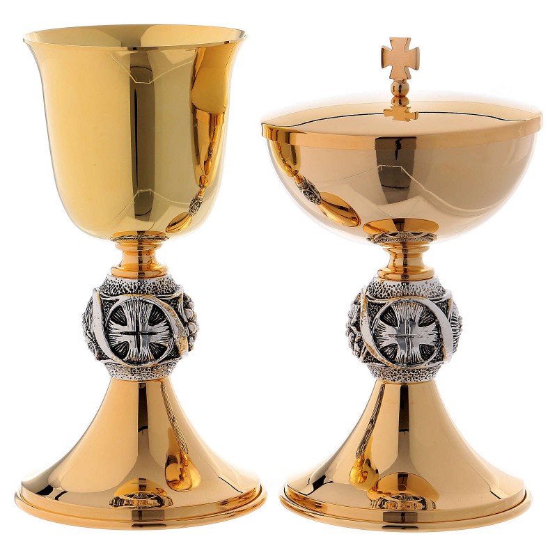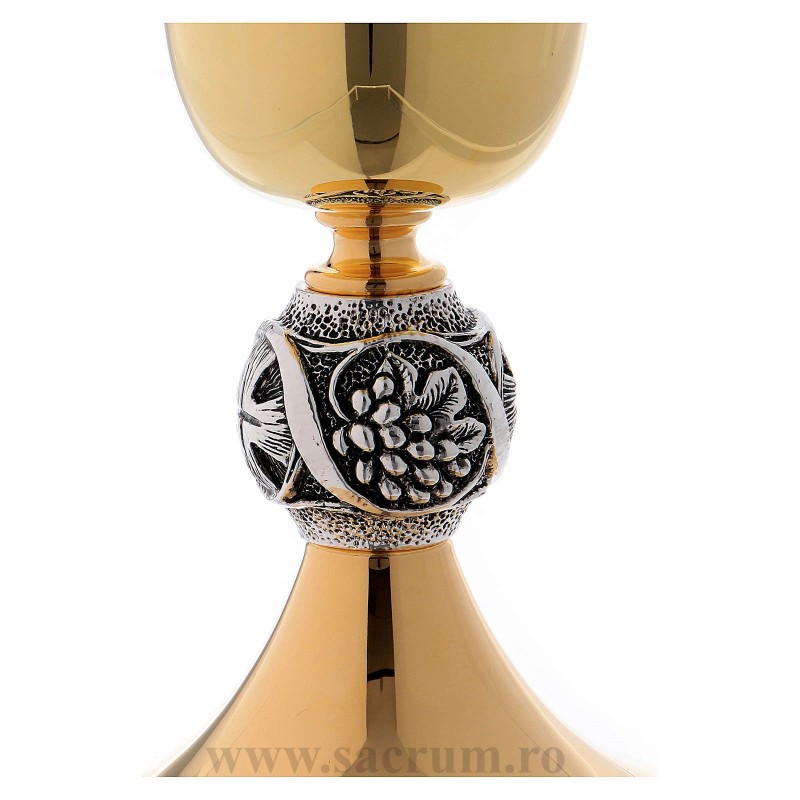 Potir din alama aurita cu aur 24K, decorat cu simboluri de cruce si struguri din argint anticat