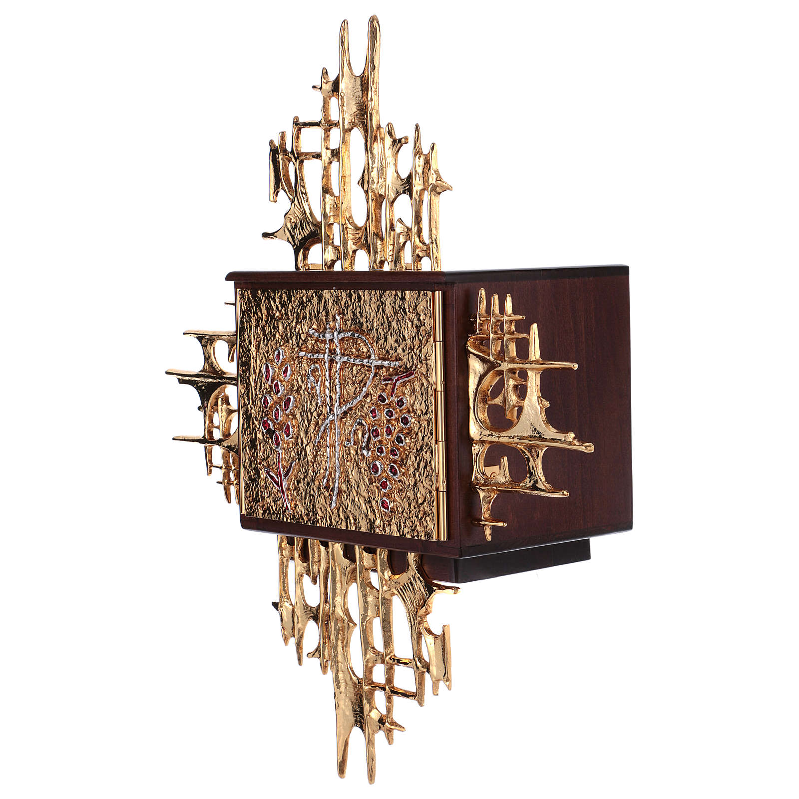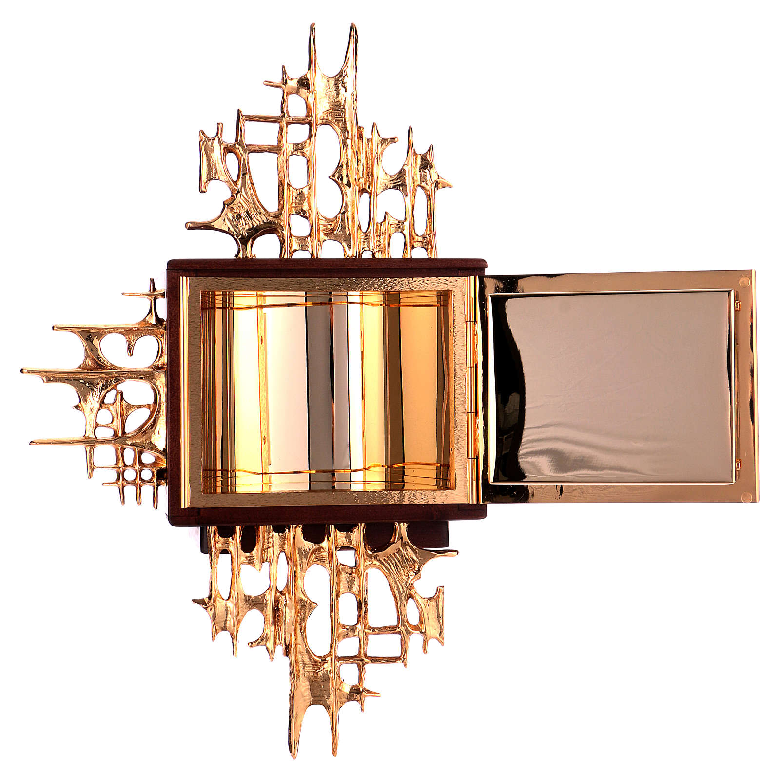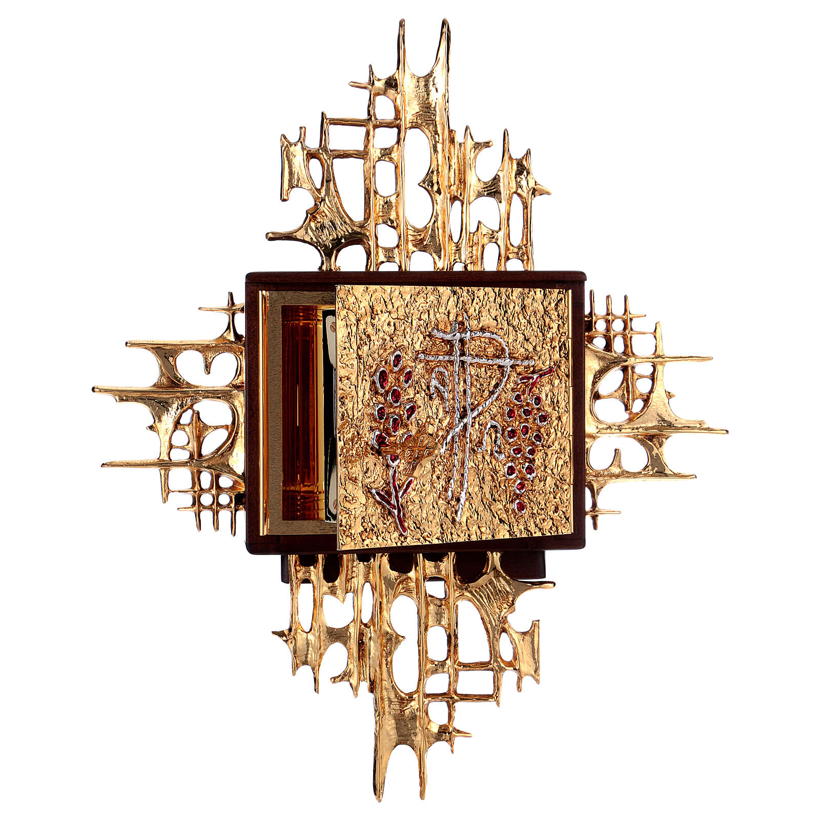 Tabernacol de perete, din lemn, cu usa din alama bruta aurita si argintata si raze