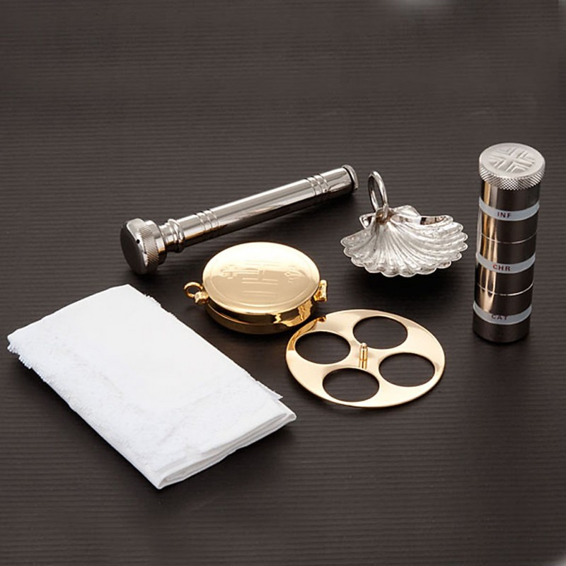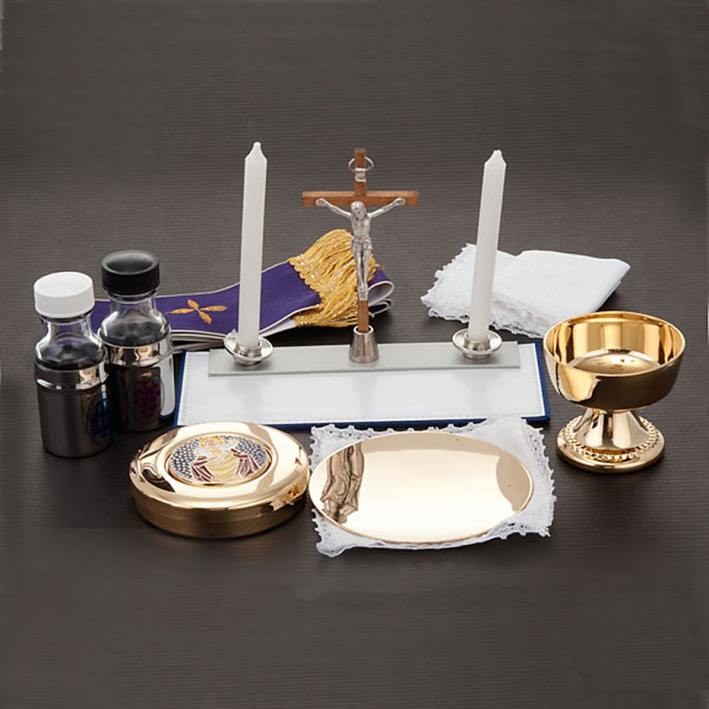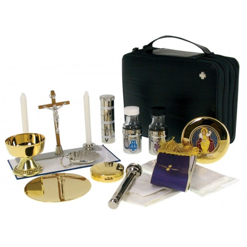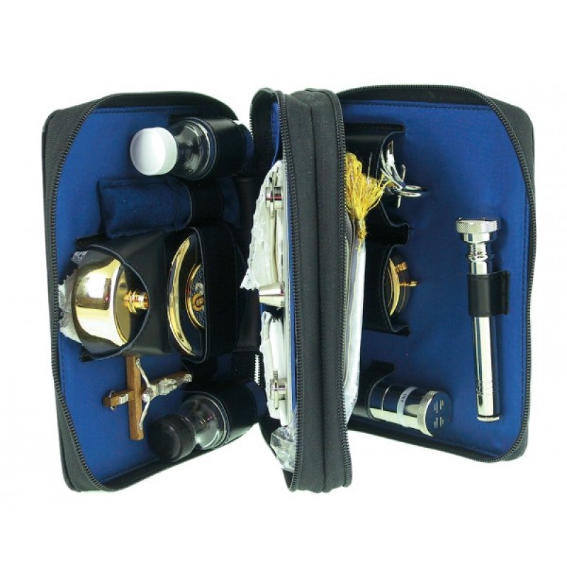 Trusa contine: potir, lumanari, cruce, ciboriu, patena, sticlute apa si vin, stola, servetele, vase uleiuri, asperges