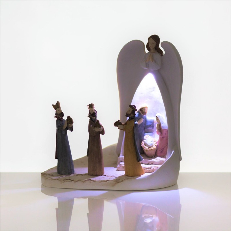 Sfanta Familie de Craciun (Isus, Maria, Iosif) cu decoratiuni si led, inaltime 15 cm