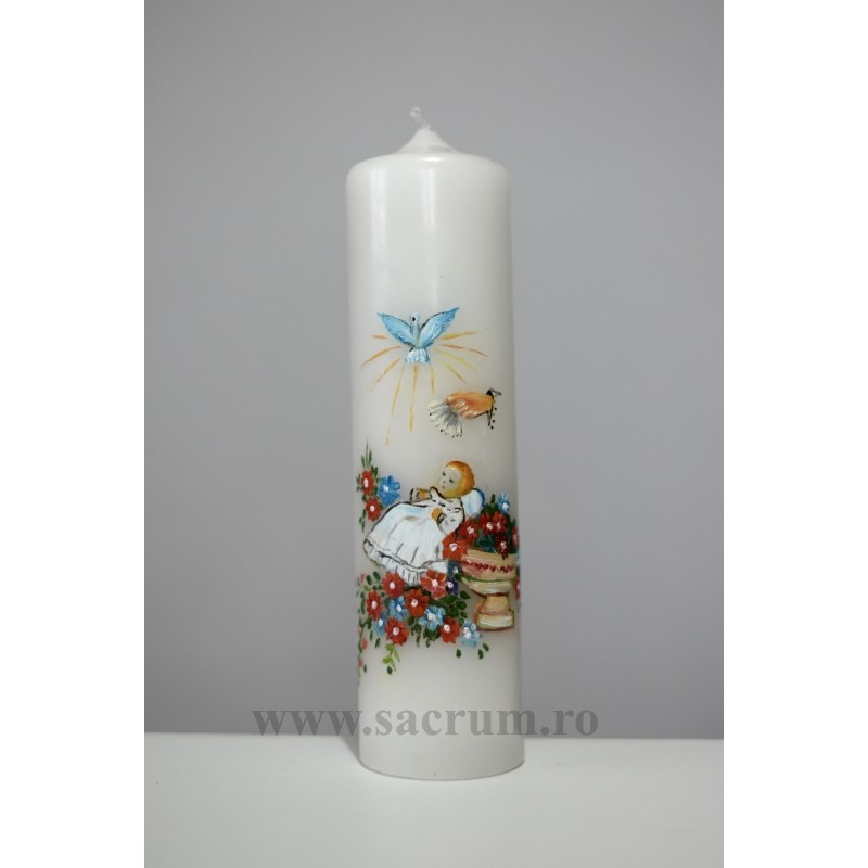 Lumanare pentru botez pictata, cu simboluri specifice.