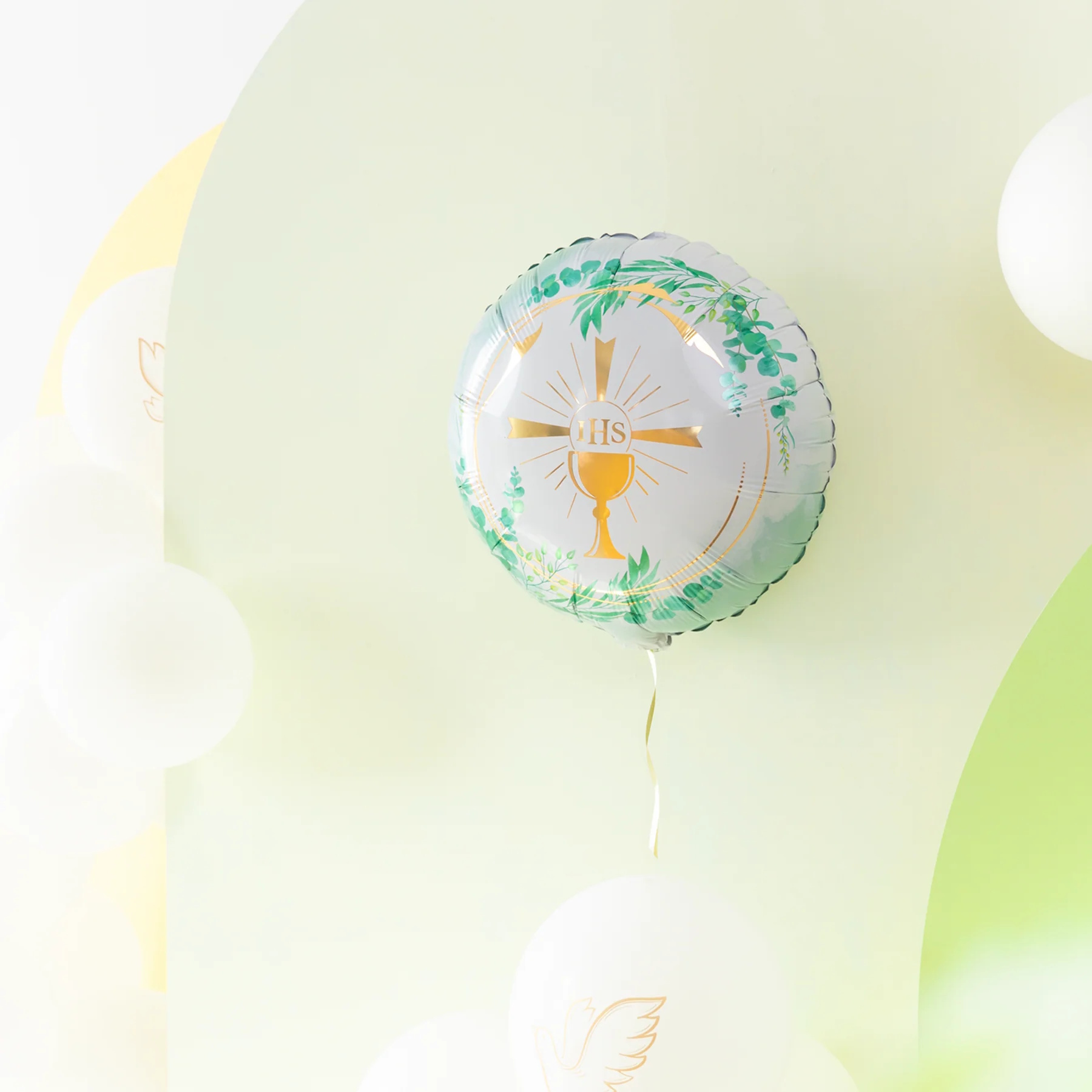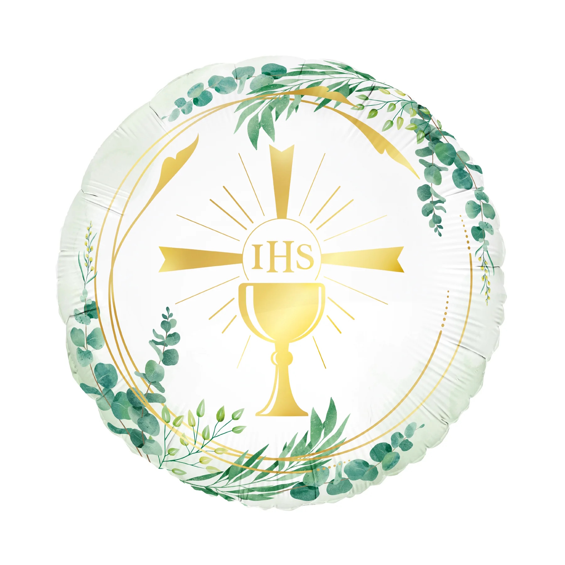 Acest balon pentru Prima Sf. Impartasanie este un plus perfect pentru orice sarbatoare religioasa. Motivul sau central – o cruce aurie formata dintr-un potir si o ostie inconjurata de raze – este o reprezentare simbolica a semnificatiei acestui sacrfament. Acest balon este o decoratiune ideala, un cadou sau o amintire pentru un copil care sarbatoreste aceasta zi importanta. Poate fi unflat cu heliu