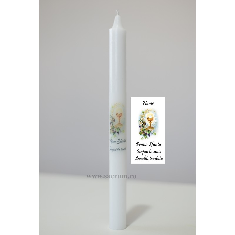 Lumanare pentru Prima Sf. Impartasanie , printata, cu posibilitatea de a adauga numele candidatului, localitatea si data evenimentului.