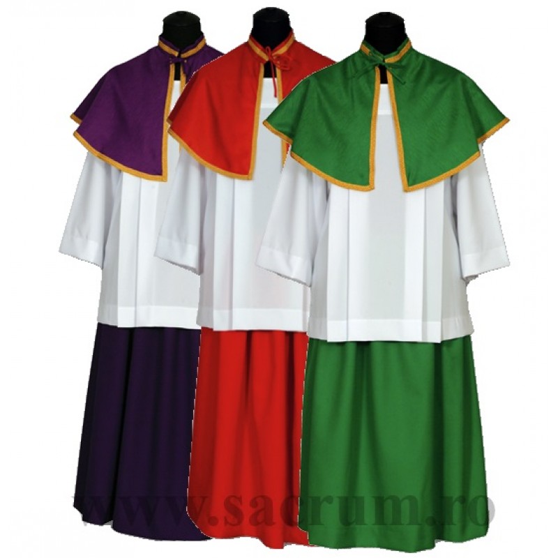 Set de haine pentru ministranti, compusa din: o cota alba, 3 gulere si 3 fuste de culoare verde, rosu si violet